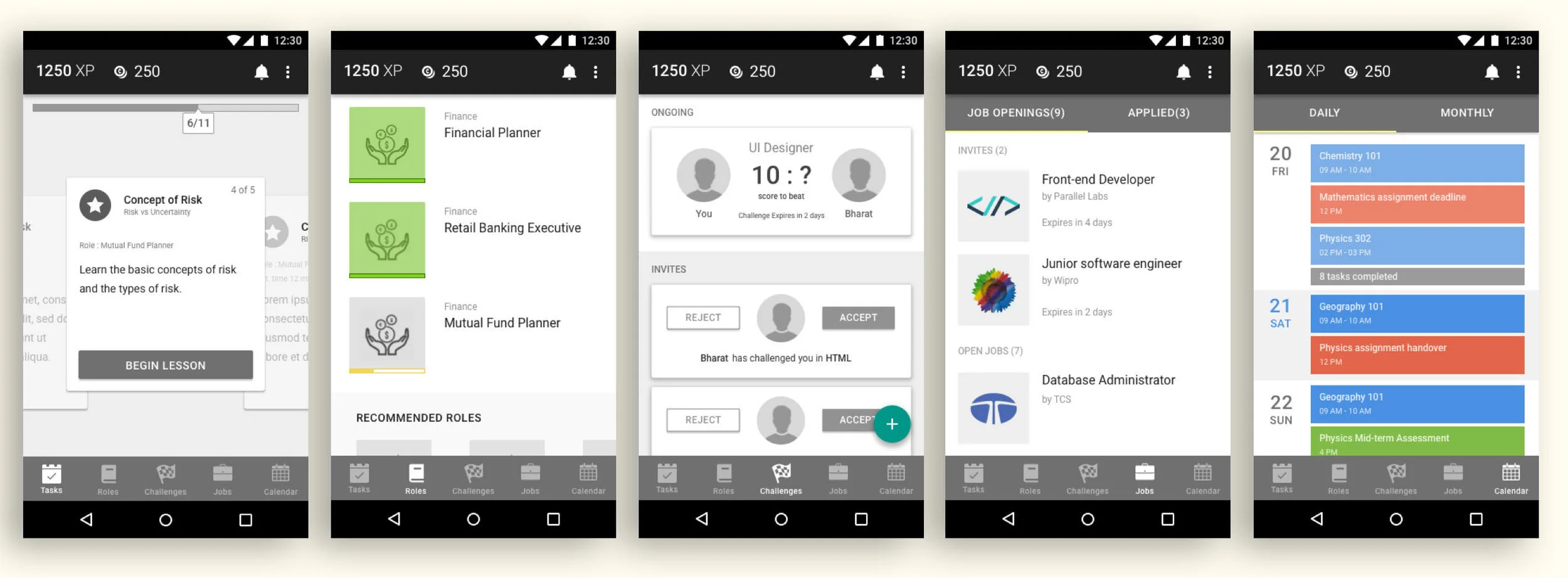 Talentify is an Android e-learning platform that aims to deliver high-quality educational content to Indian college students. Talentify lays emphasis on giving the students practical skills that would make them more employable and provides direct access to recruiters from all over India. In this design, we developed information architecture, gamification systems to keep the students engaged, a variety of content types, and a robust visual system to support these different content types.